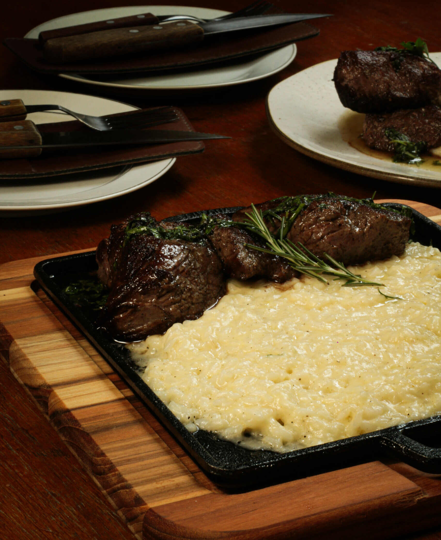 Alcatra grelhado (180g) servido com risoto italiano a base de alho poró, finalizado com chimichurri da casa.