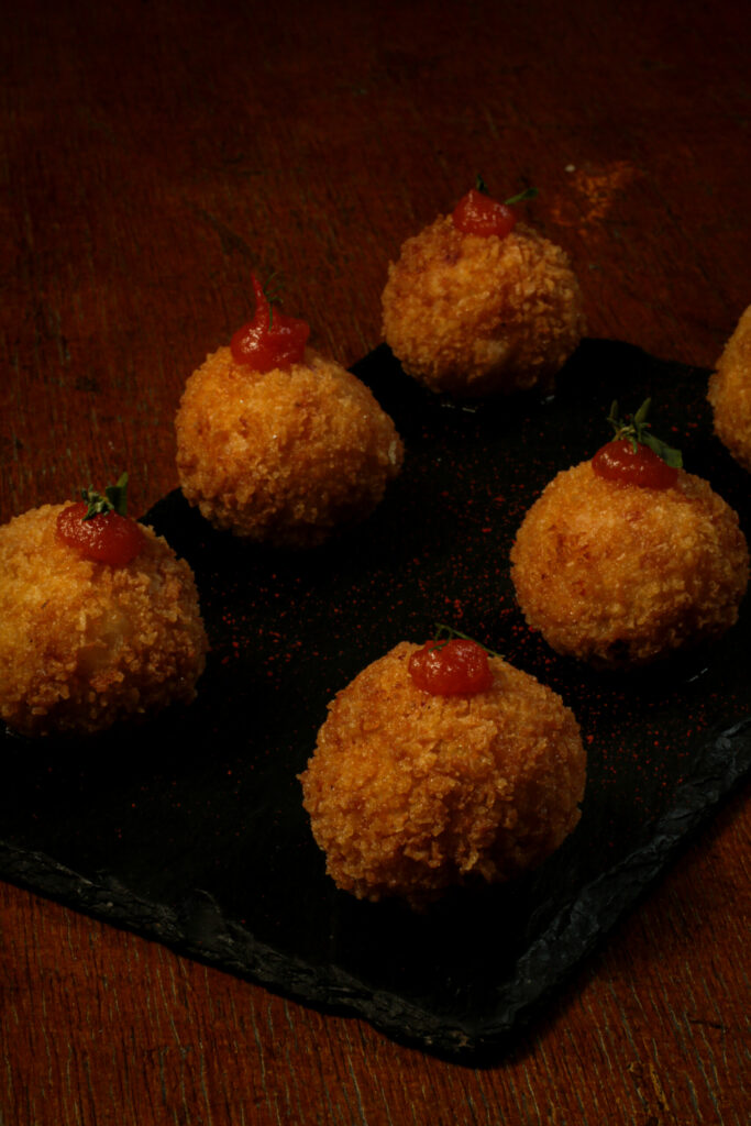 Fried risotto dumplings, stuffed with blumenau sausage.