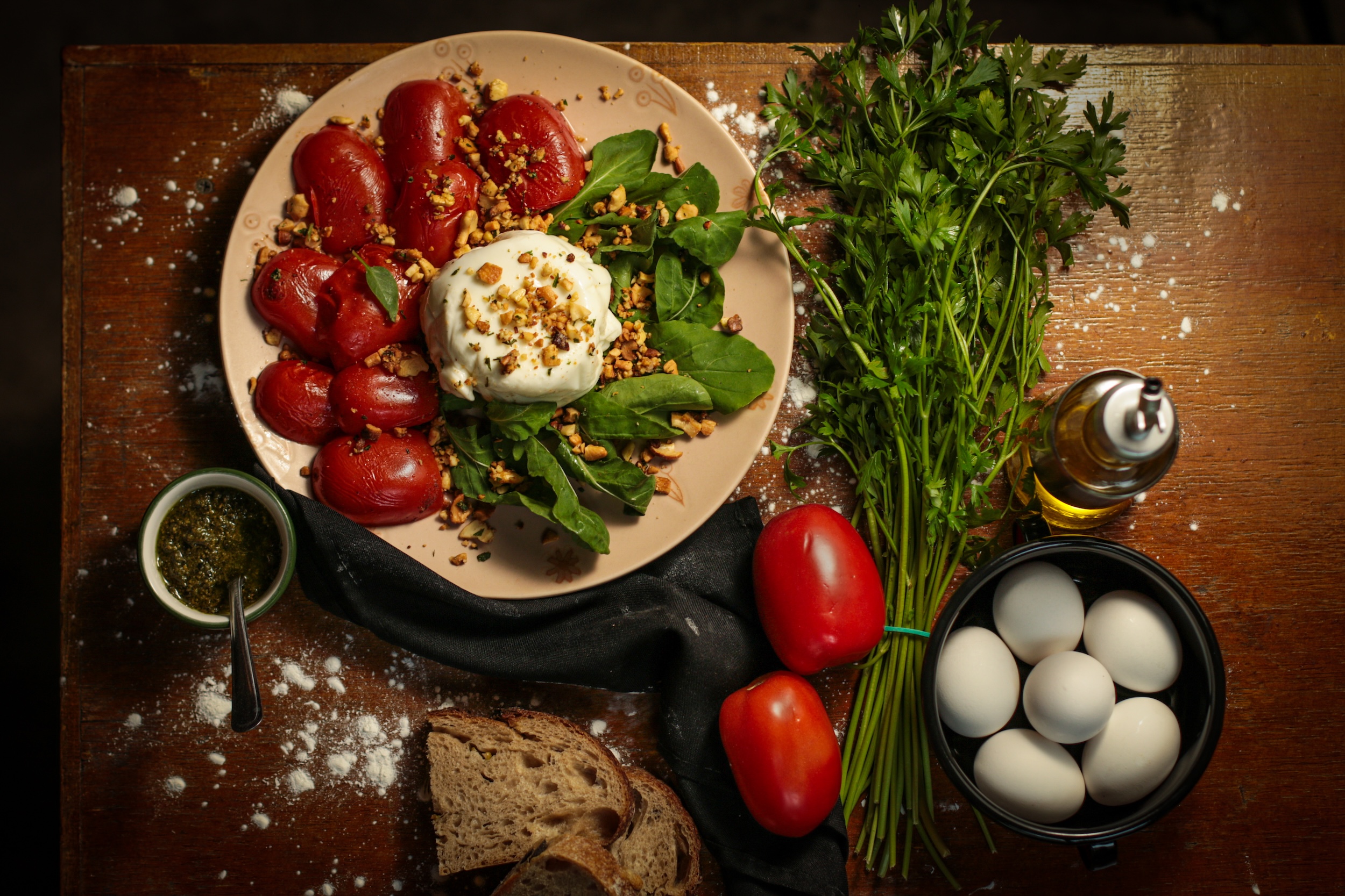 Creamy burrata, marinated tomato, cashew nut flour, herb pesto, arugula, reduced balsamic vinegar. Served with sliced Italian bread