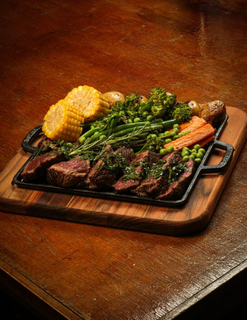 Alcatra em tiras servido com brócolis, cenoura, batata bolinha e milho espiga (ou pinhão) grelhados, acompanha chimichurri da casa