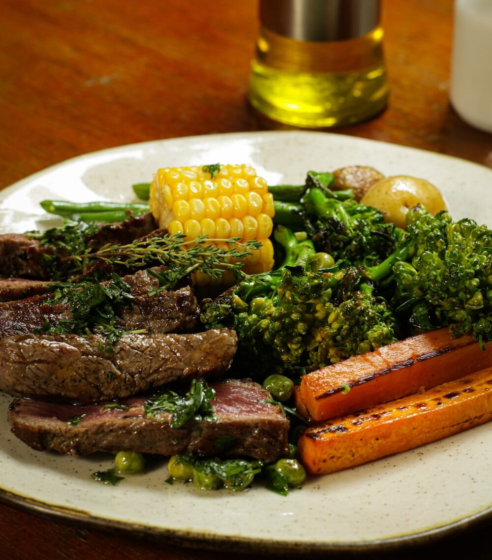 Rump steak served with grilled broccoli, carrots, parsley potatoes and corn on the cob, served with house-made chimichurri