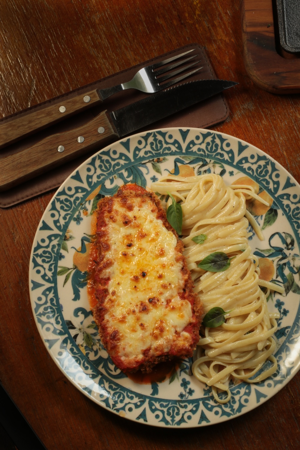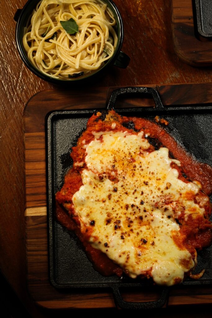 Chicken or beaf parmigiana fillet served with fettucine in butter