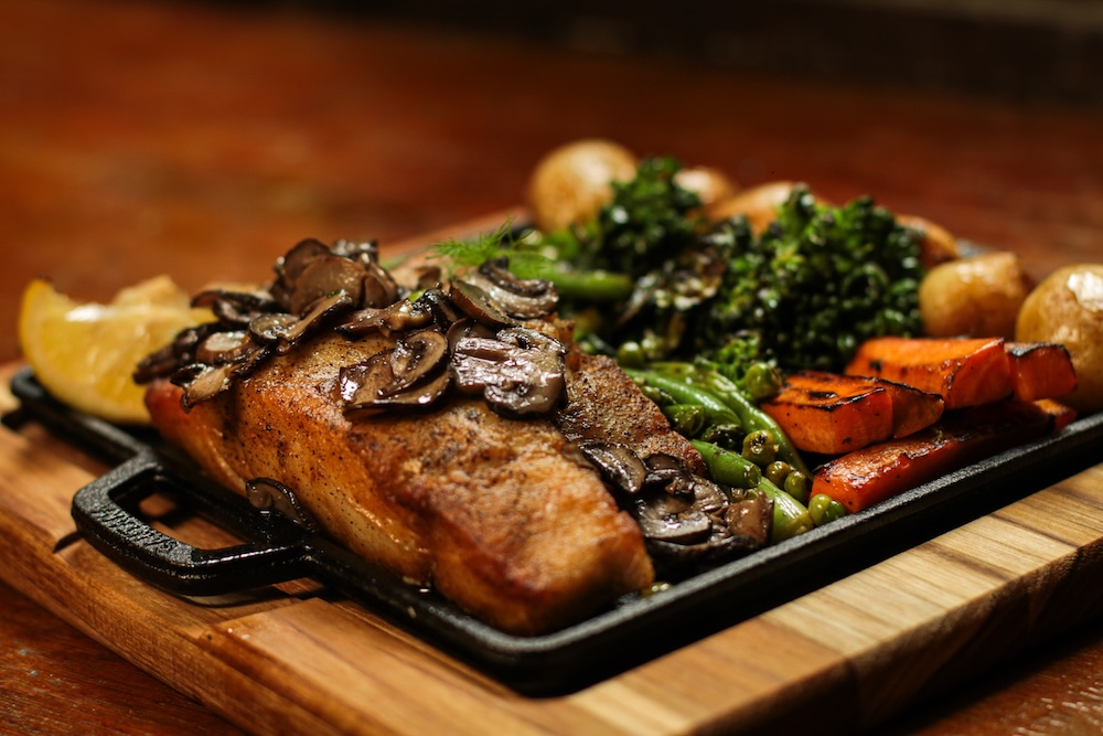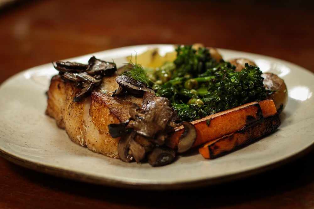 Tilápia ou equivalente da estação finalizada com cogumelos frescos salteados. Acompanha cenoura, vagem francesa, ervilhas frescas, batata bolinha confit, brócolis e limão siciliano tostado. Pescado da estação servido com purê de abóbora cabotiá e brócolis rama grelhado