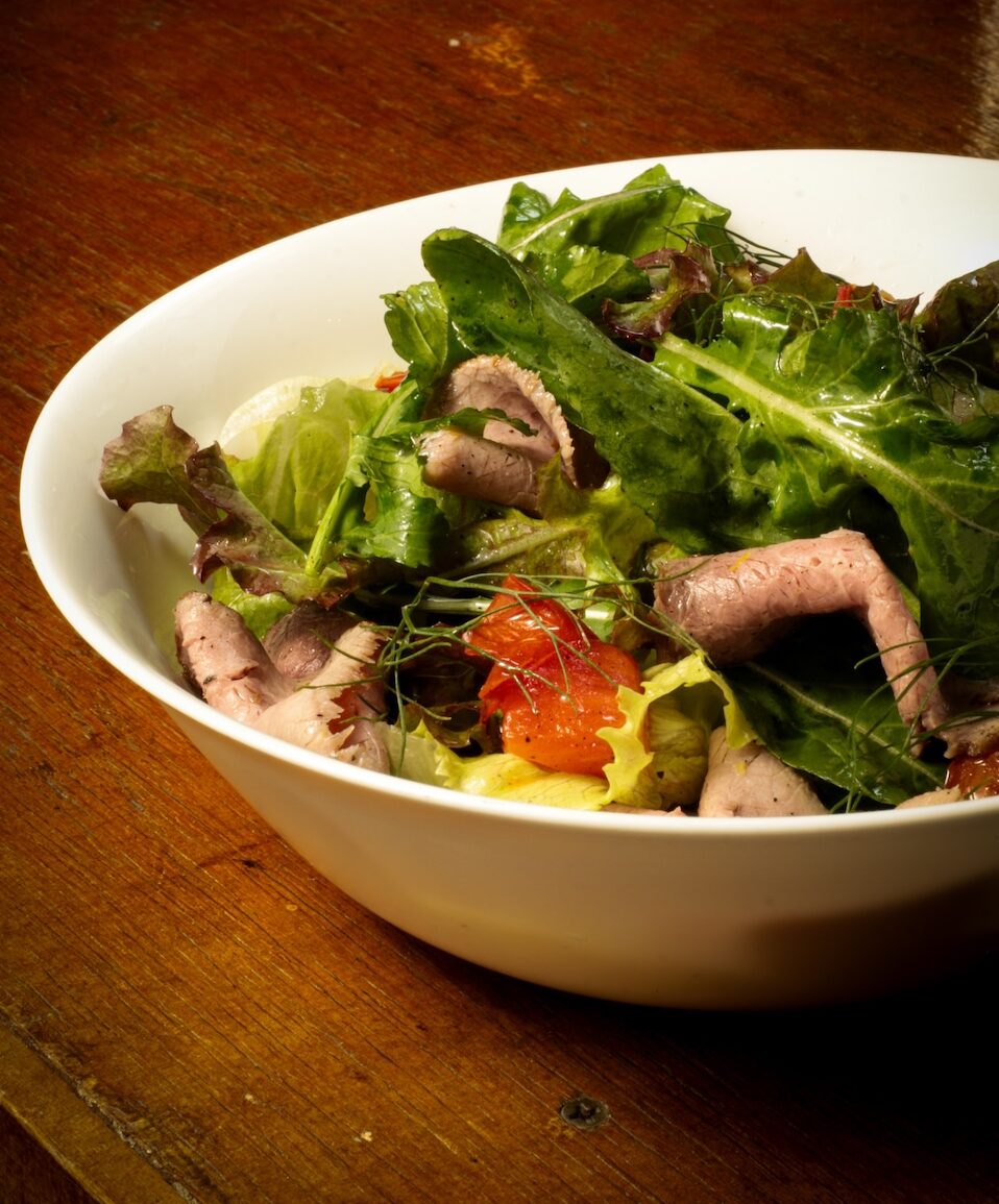 American lettuce, red lettuce, arugula, confit tomatoes, fennel pickles, and roast beef. For one person or two. Gluten-free.