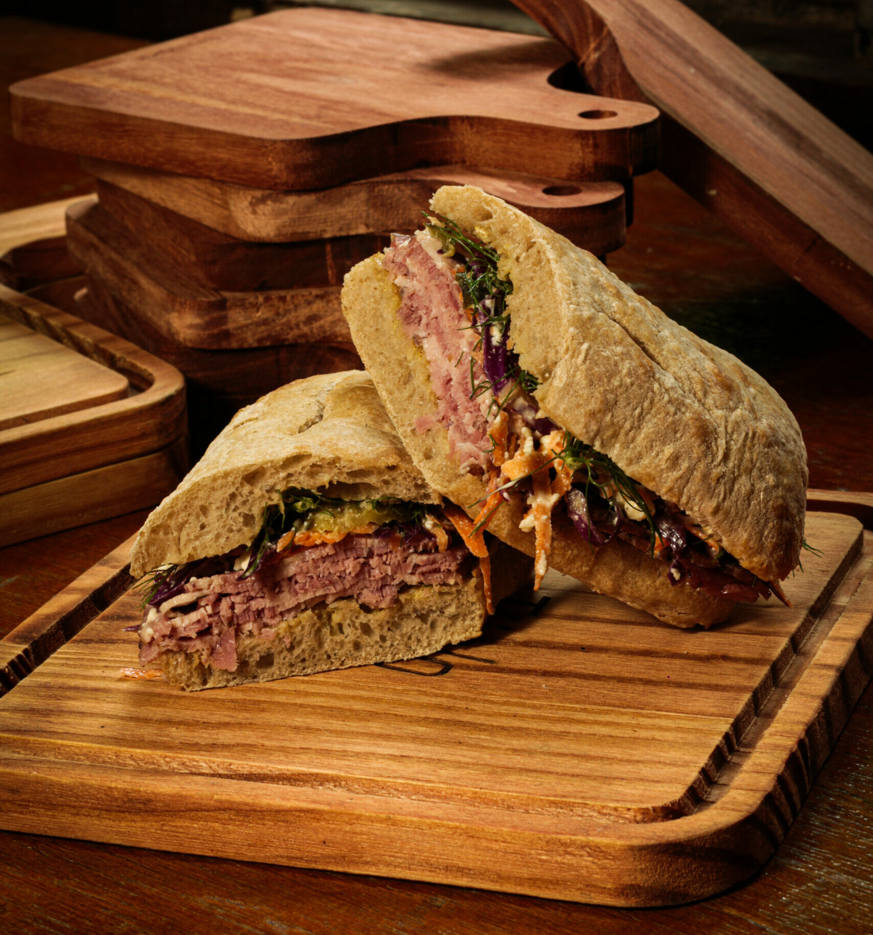 Ciabatta, ricotta cream, roast beef, fennel pickles, and arugula. Served with smoked mayonnaise. Contains gluten.