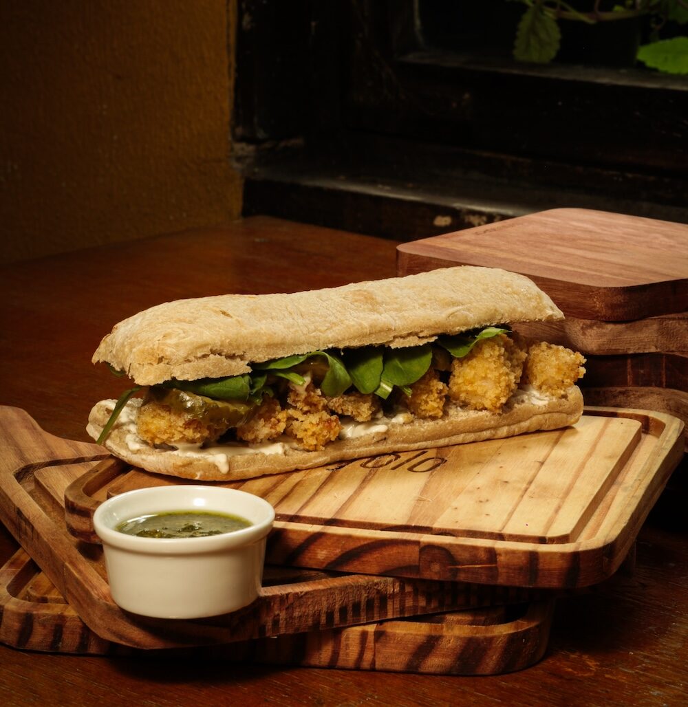 Ciabatta, maionese defumada, pescada amarela à milanesa, picles agridoce e rúcula.