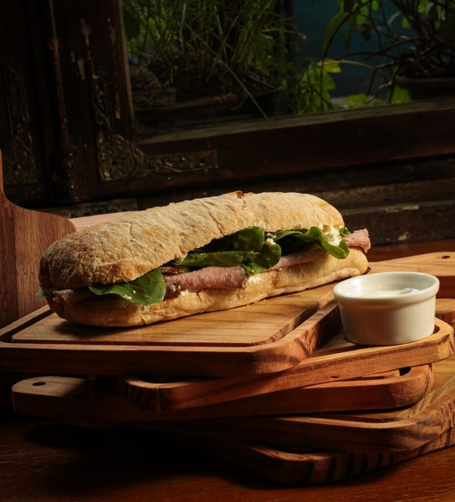 Ciabatta, creme de ricota, roast beef, picles de erva doce e rúcula.