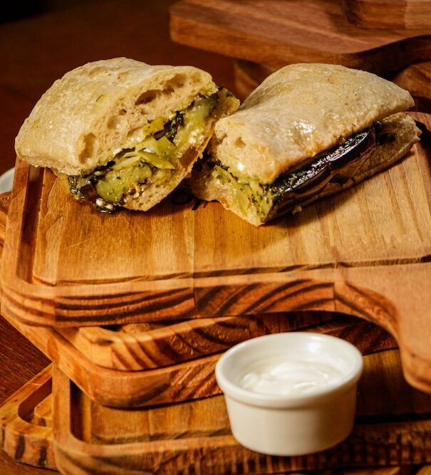 Ciabatta, smoked mayonnaise, breaded yellowtail fish, sweet and sour pickles, and arugula.